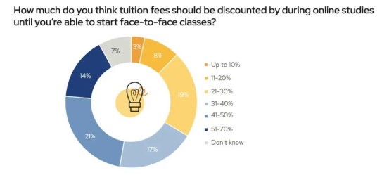 因此,81%的受访学生认为,在学校恢复面授课程之前,网课的学费应该打折。其中,有21%的学生认为学费应该直接减半。