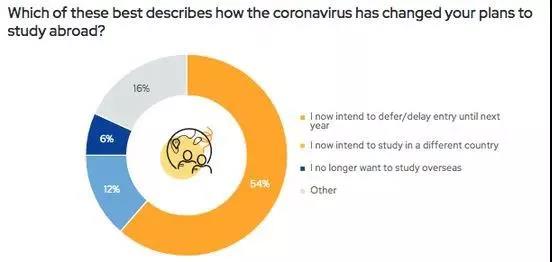 从调研数据中也能明显看出,有54%的留学生计划推迟留学时间,12%的留学生选择改变留学国家,6%的学生最终选择放弃留学。